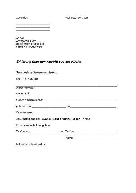 Kostenloses Formular für den Kirchenaustritt in Bayern herunterladen. Einfach ausfüllen und den Austritt aus der Kirche offiziell erklären – schnell und unkompliziert für verschiedene Konfessionen.