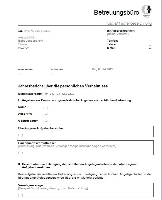 Kostenloses PDF Formular für den Jahresbericht Betreuung NRW zum Download, ideal für dauerhaft in Heimen betreute Personen mit Angaben zu Adresse und Aufenthaltsort.