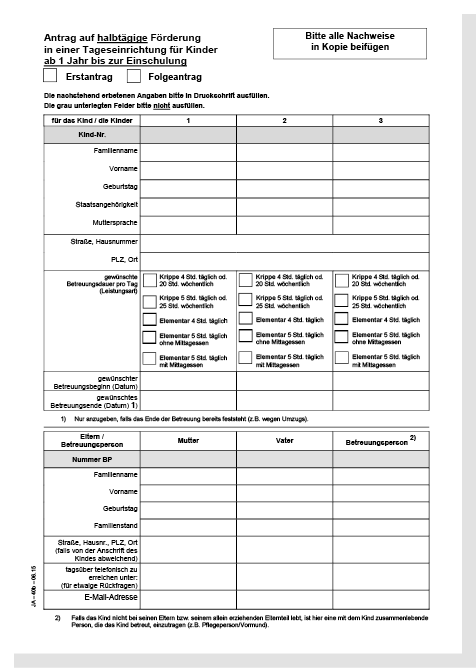 Kita-Gutschein Folgeantrag Formular kostenlos herunterladen und alle nötigen Nachweise als Kopie beifügen. Einfach ausfüllen und Antrag für Betreuung in der Tageseinrichtung stellen.